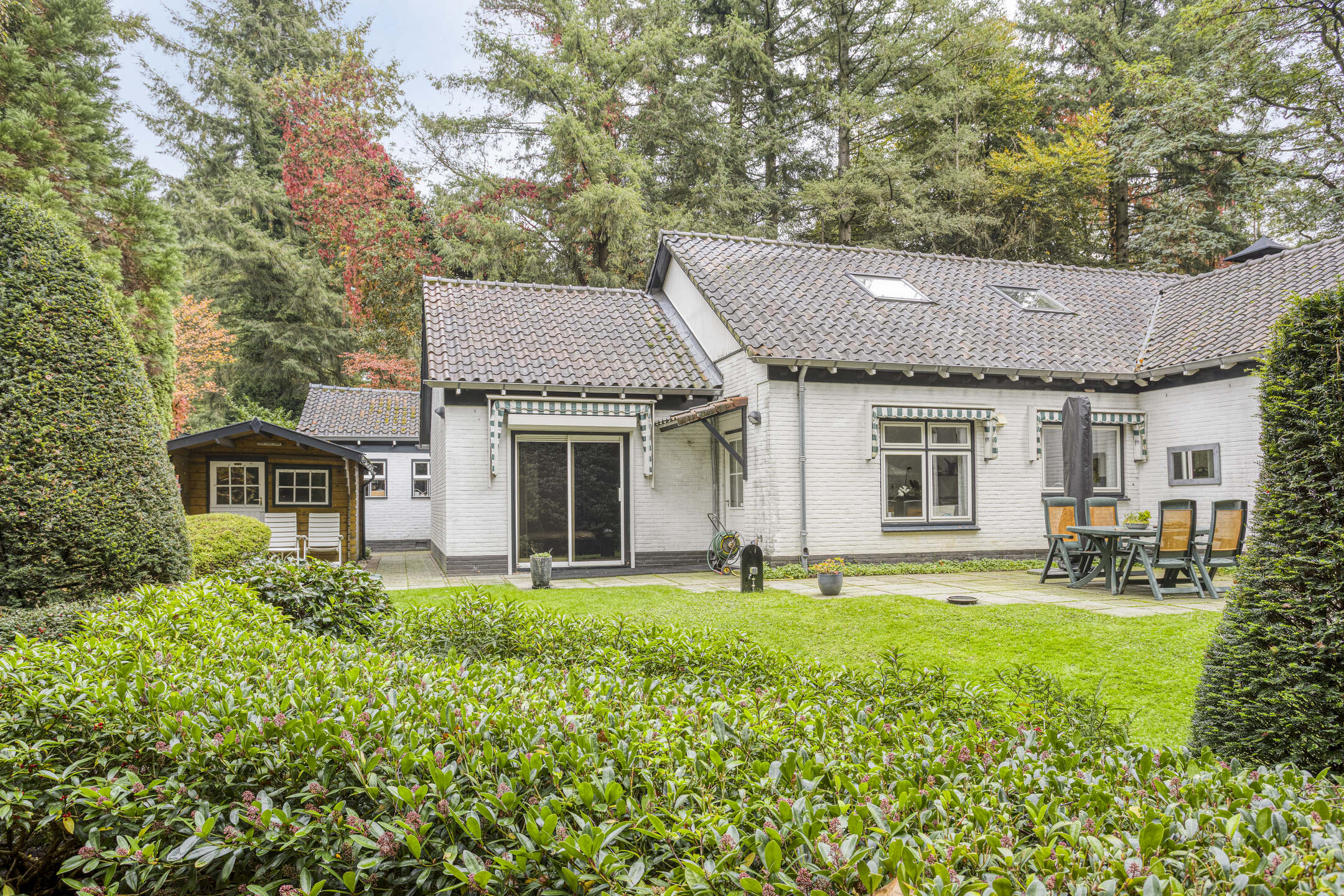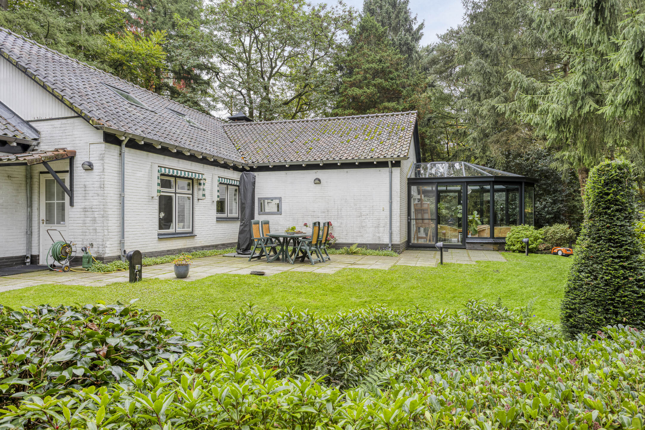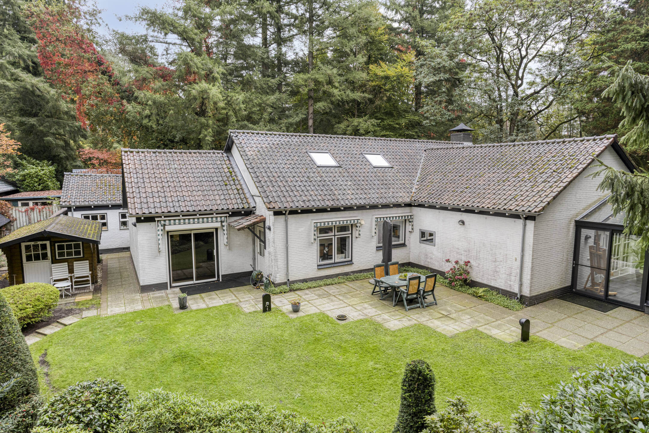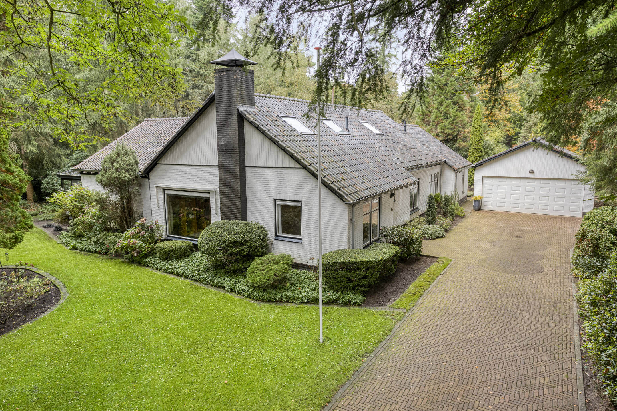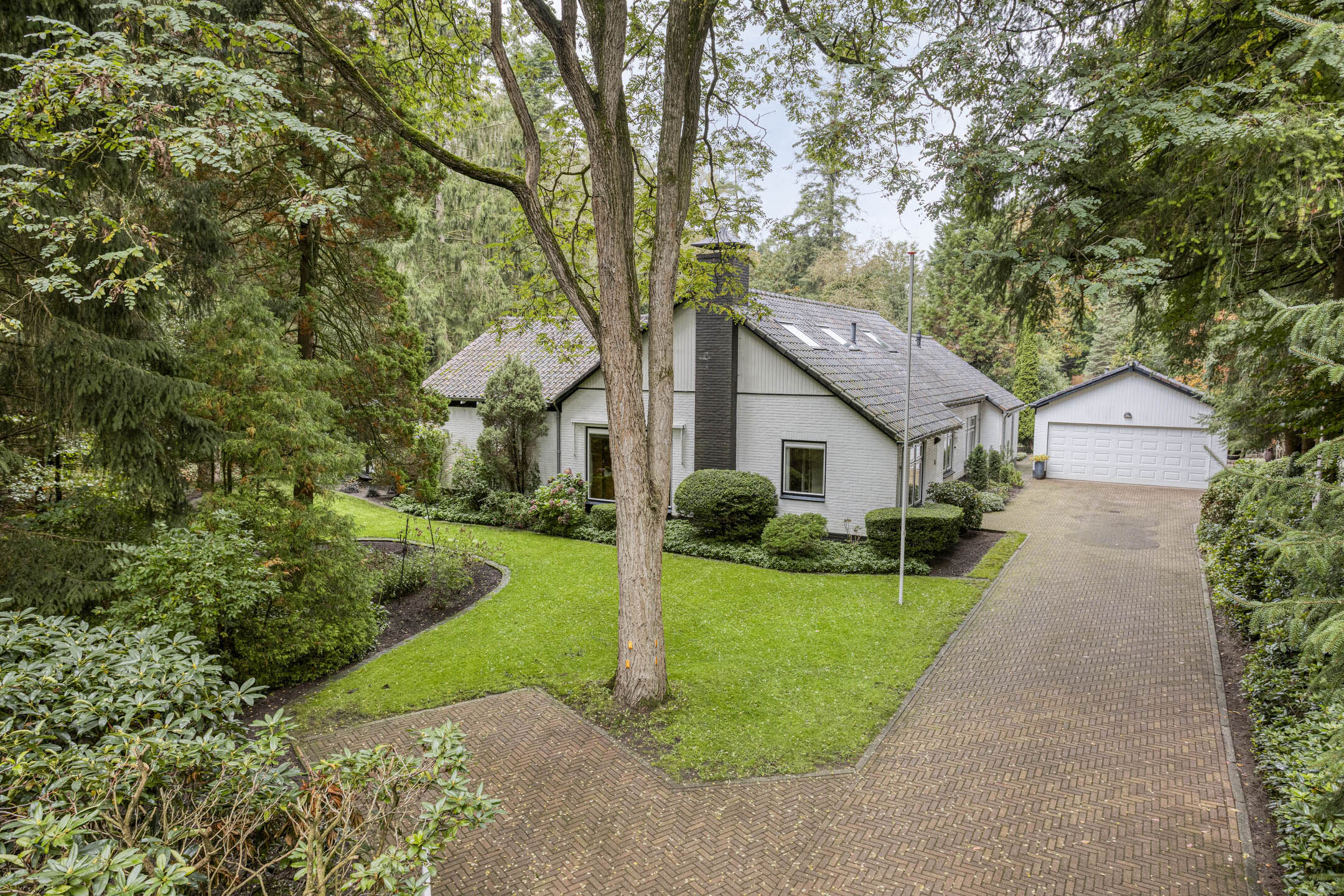 Bij de woning behoort een vrijstaande stenen garage ± 32 m² met vliering en kelder en een vrijstaande houten berging.