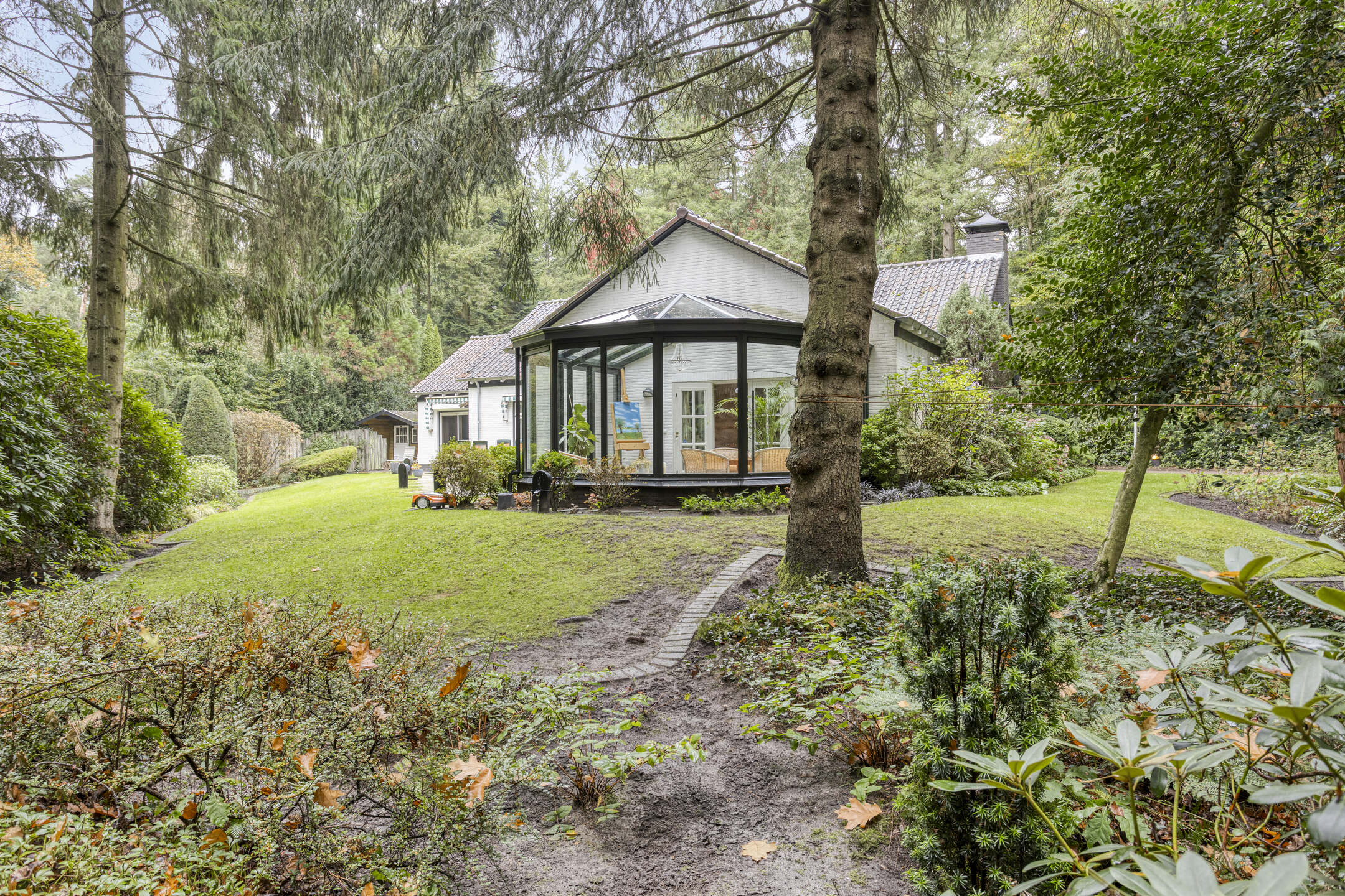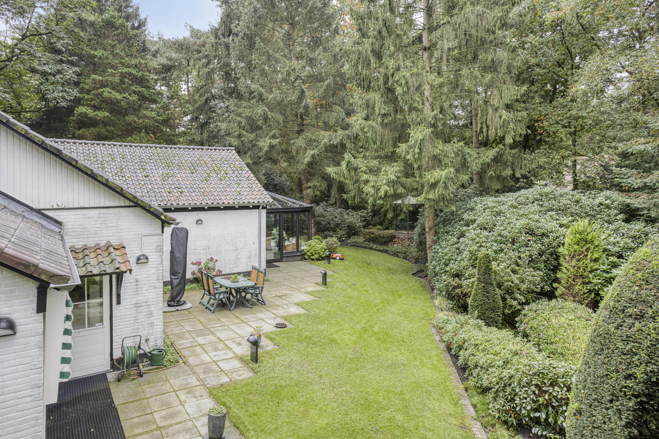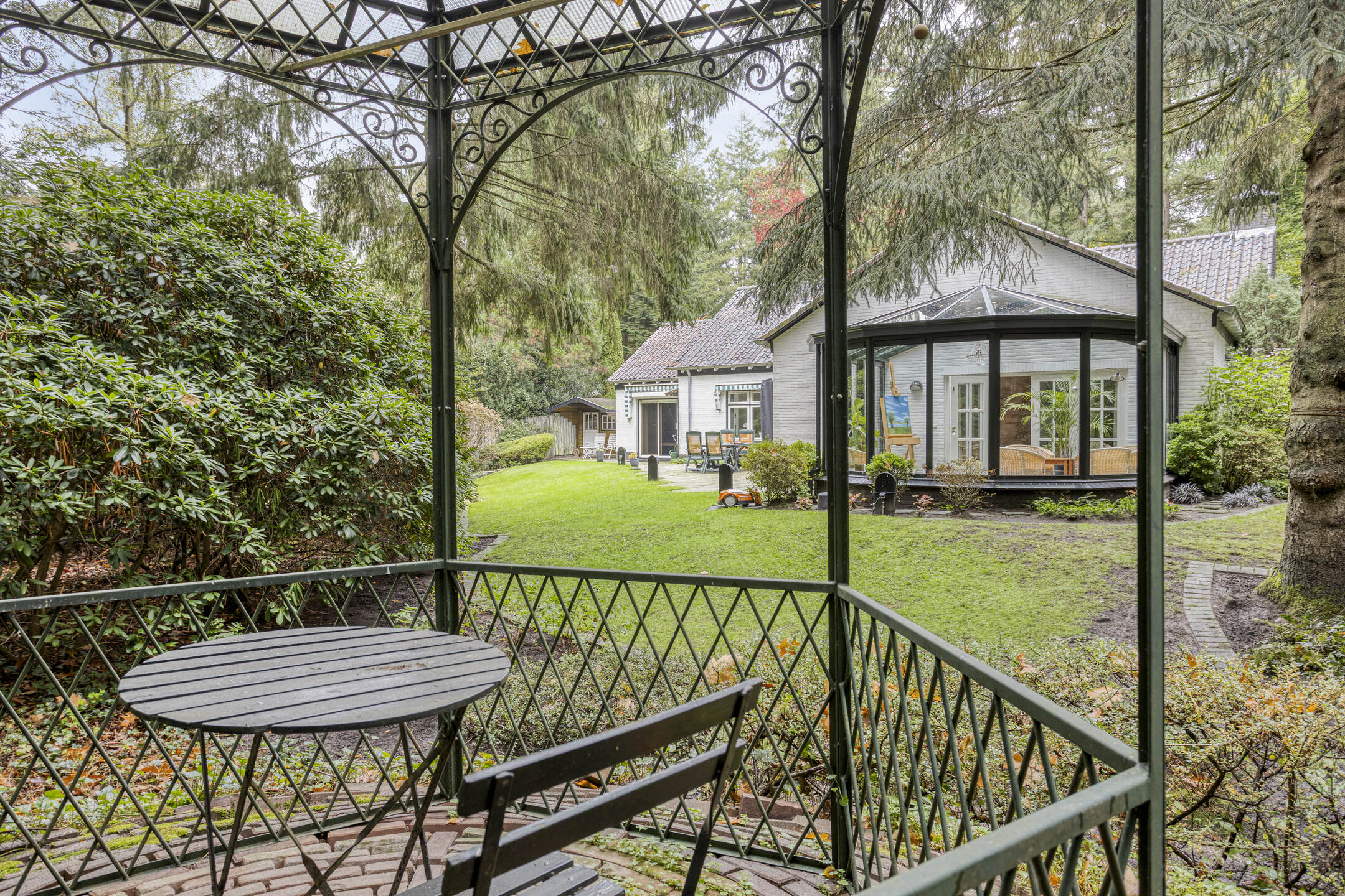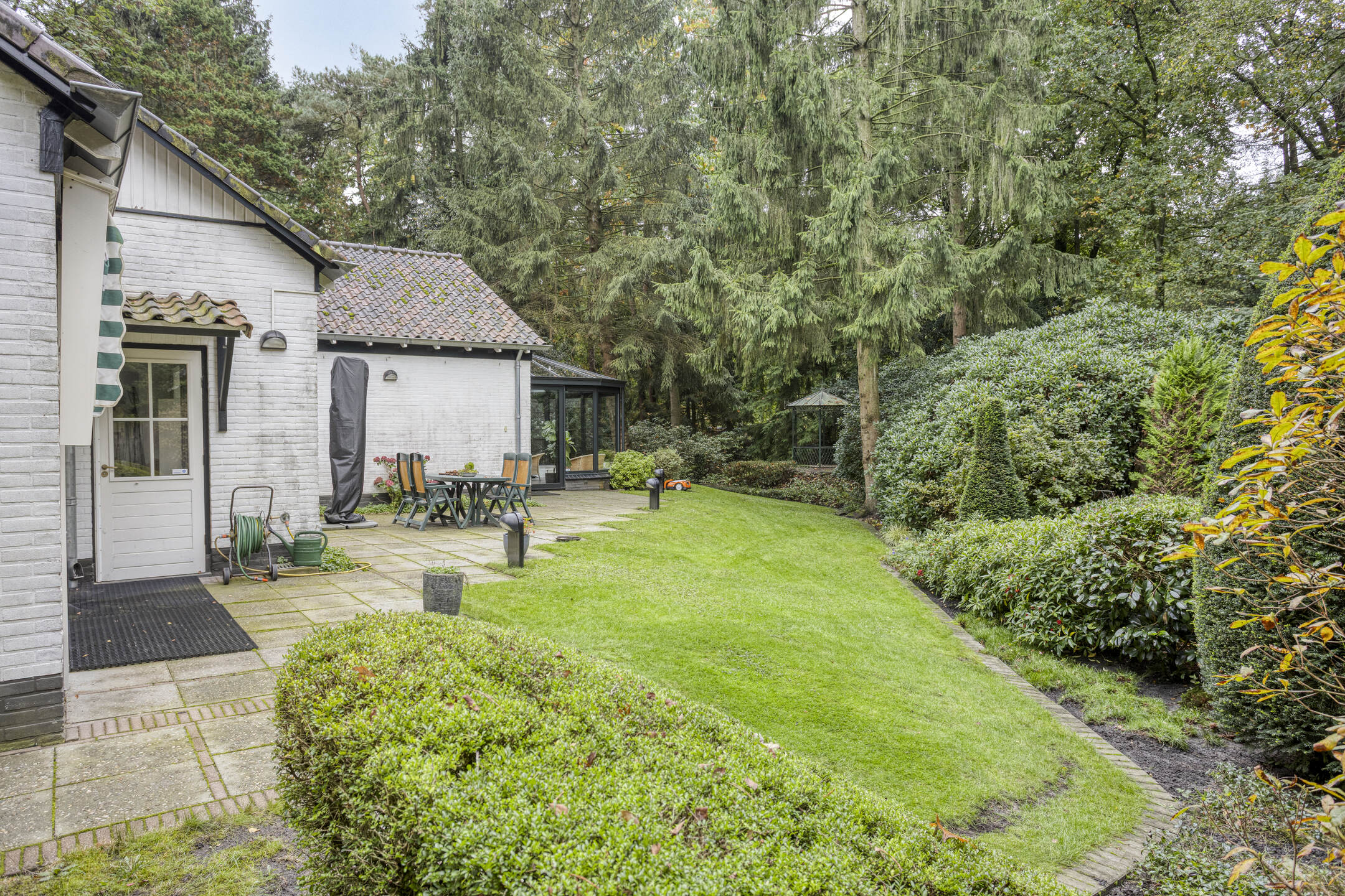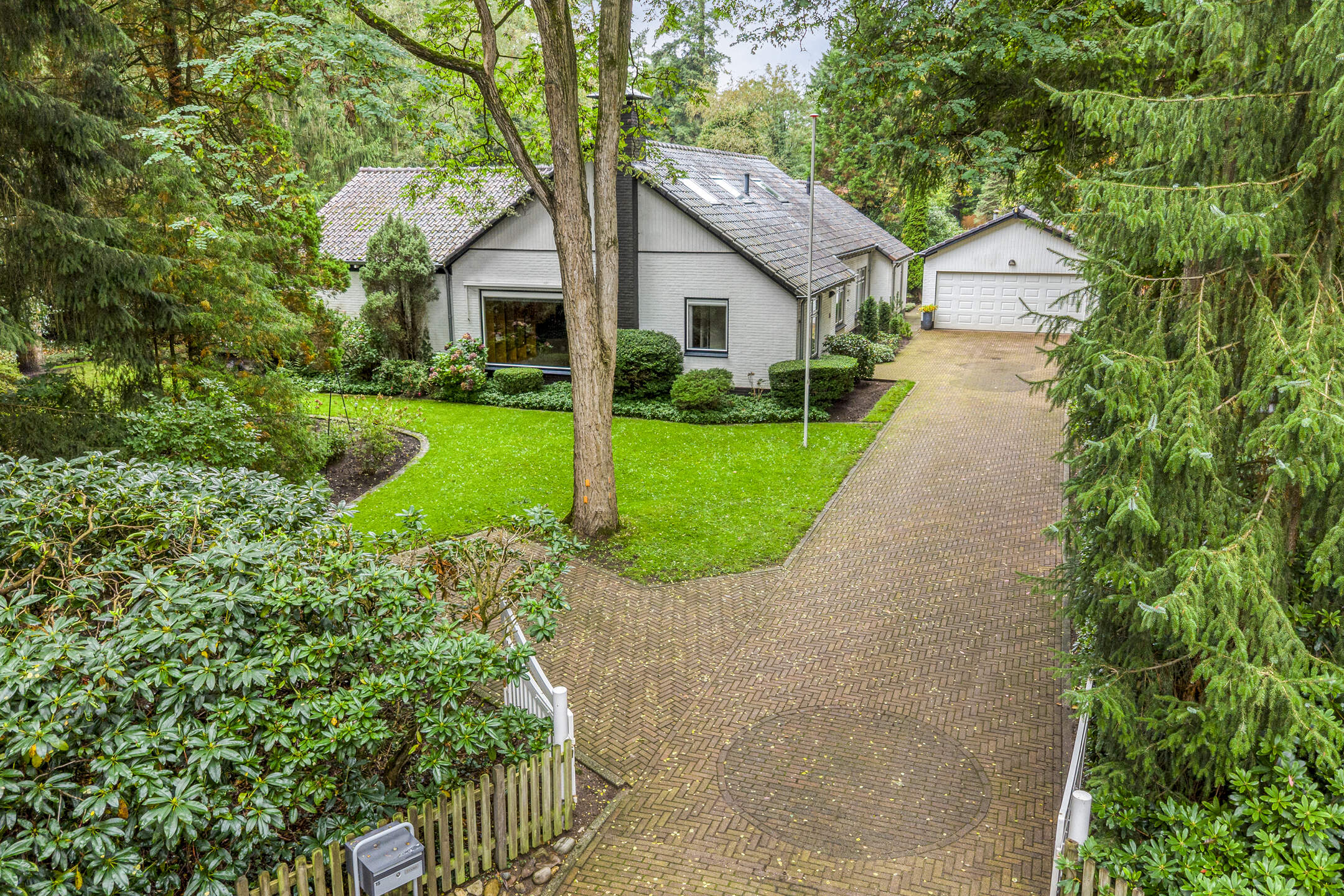 Het bijbehorende perceel is groot 2.378 m² en is volledig omheind met aan de voorzijde een fraaie toegangspoort met royale oprit waar zich ruim voldoende parkeergelegenheid bevindt. De prachtig verzorgde bostuin beschikt over een royaal gazon, diverse plantenborders, een groot zonneterras en terras met prieel. De tuin is uitstekend onderhouden en beschikt over fraaie bomen.