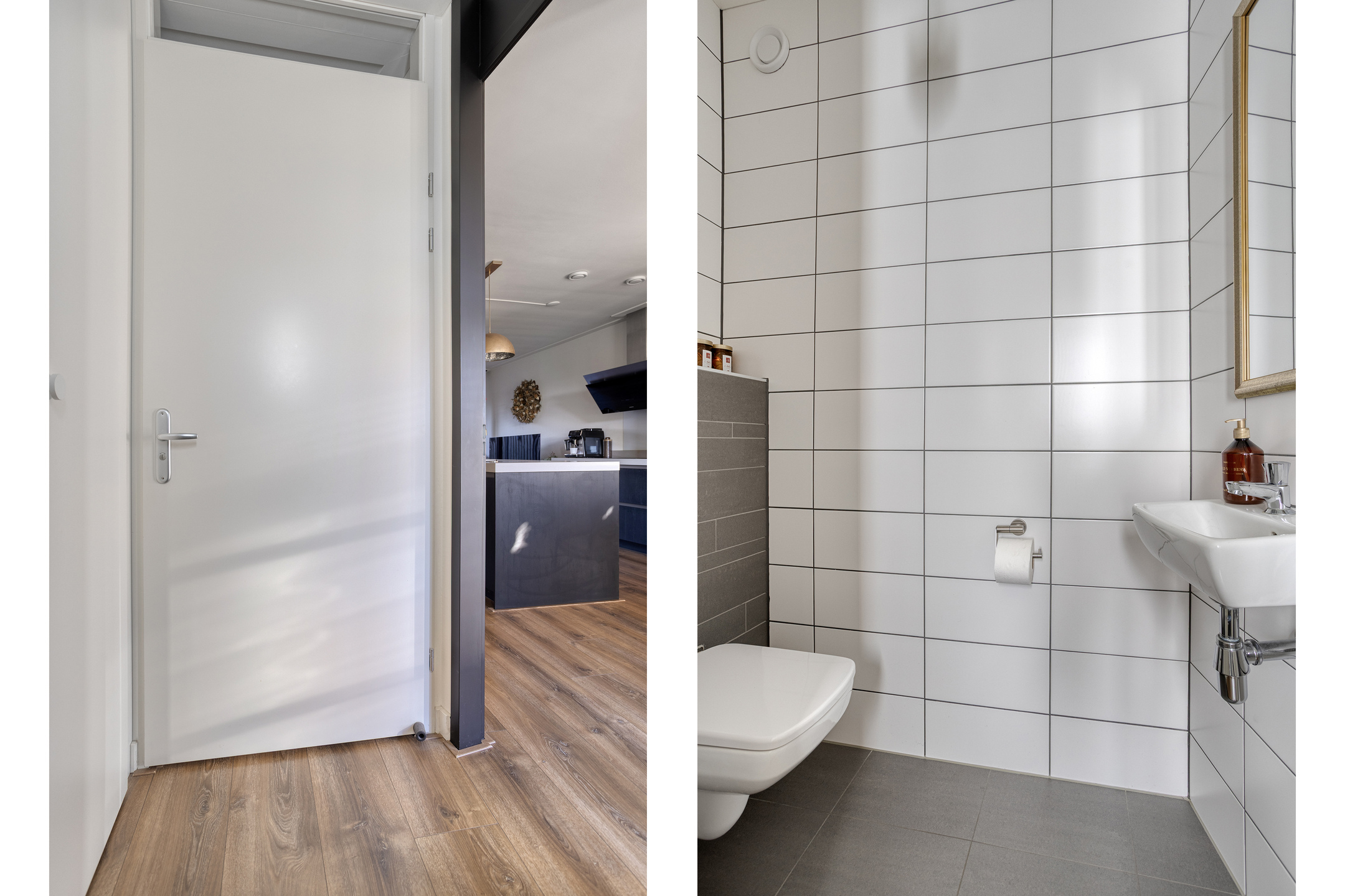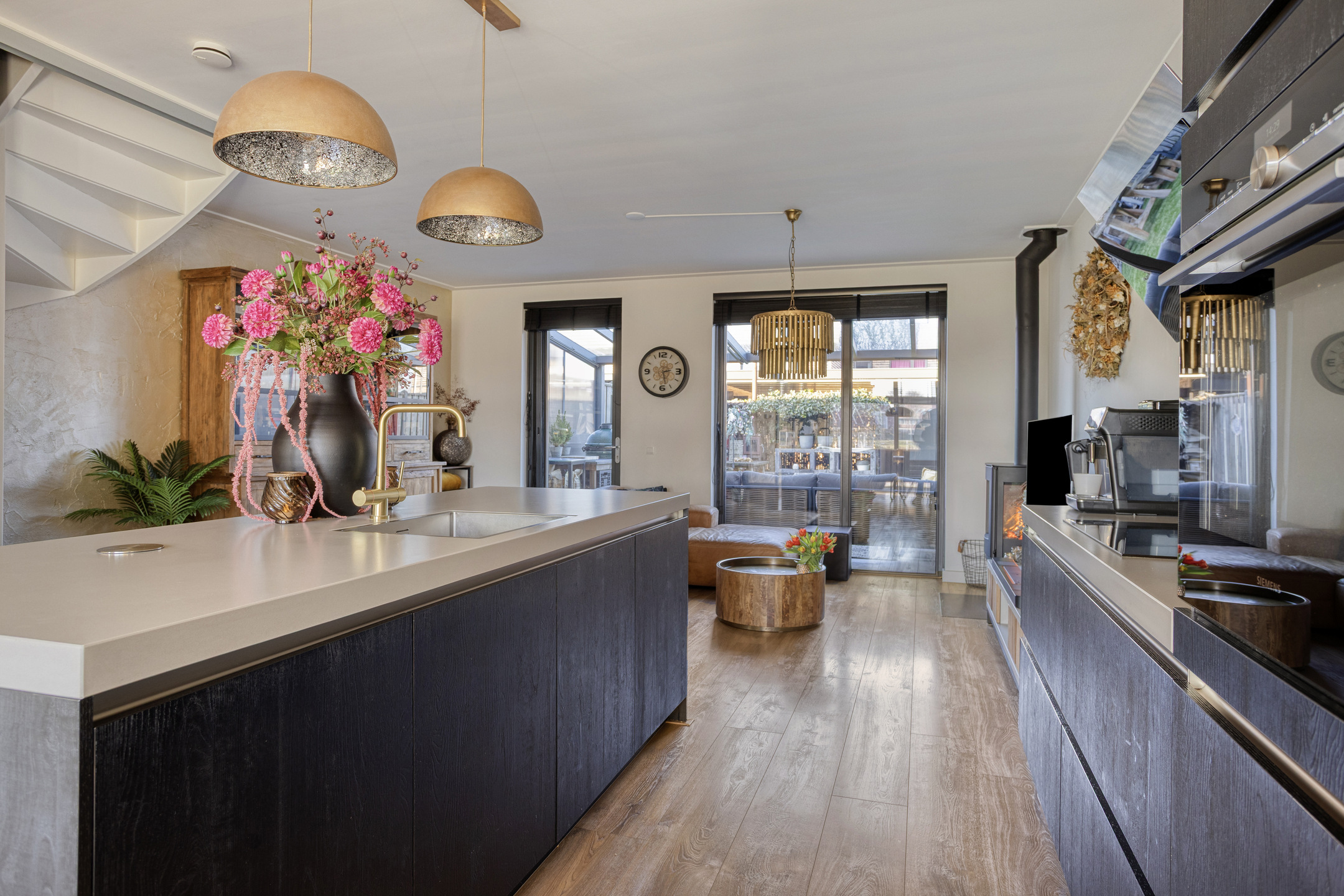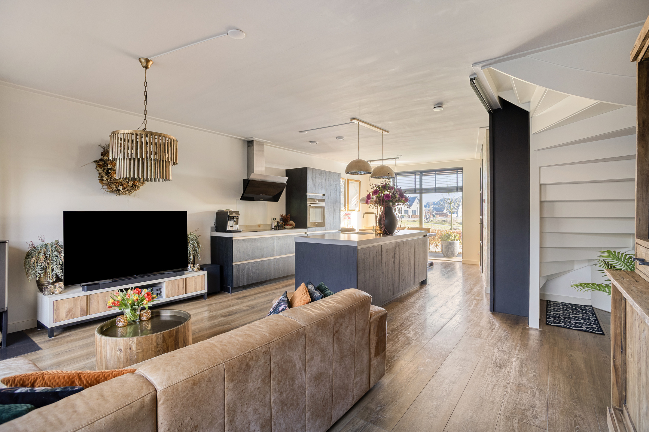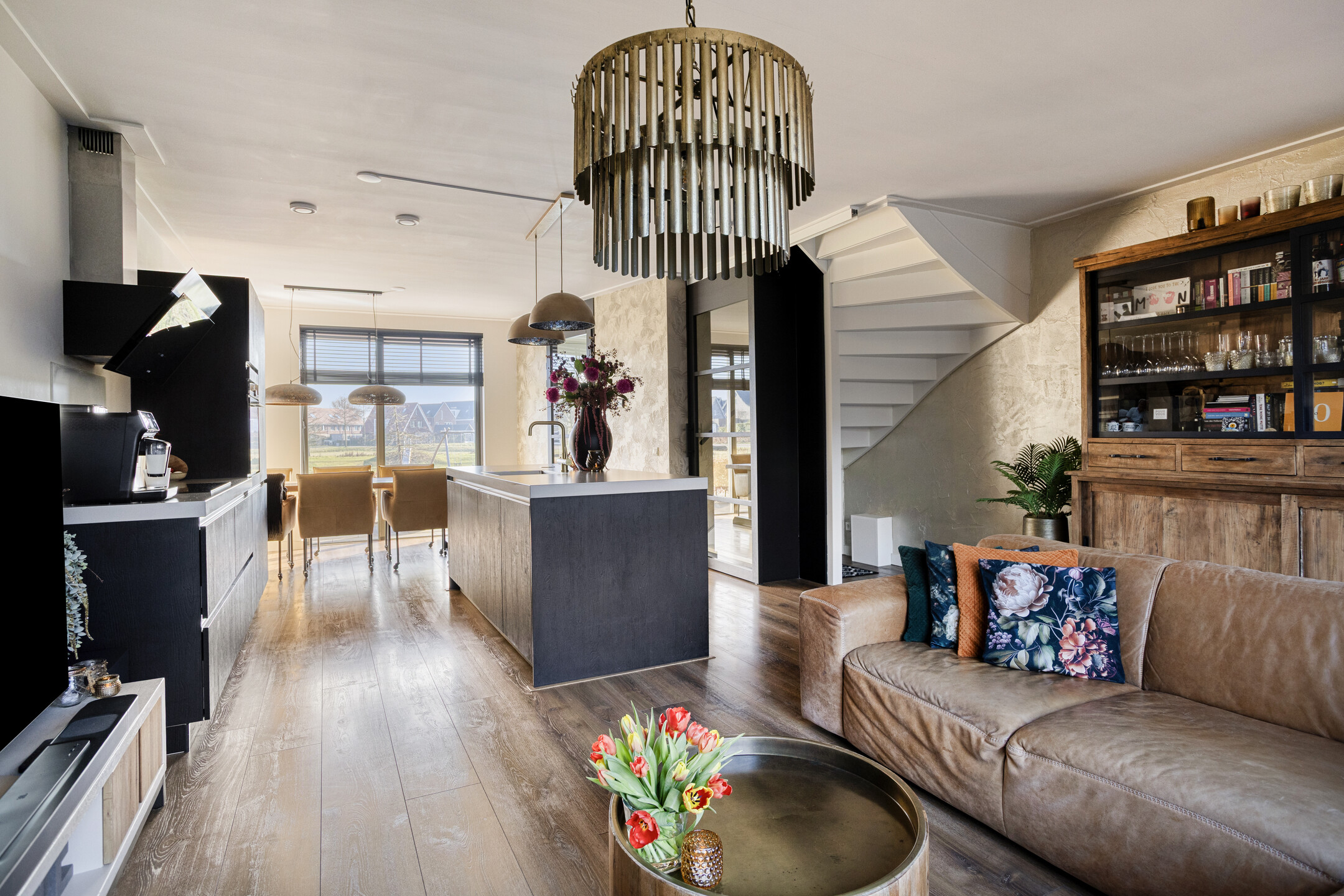 Entree met hal, praktische opbergkast, modern toilet en meterkast. De lichte woonkamer met open keuken vormt het hart van de woning. Dankzij de centrale keukenopstelling blijft u altijd verbonden met uw gezin of gasten. De sfeervolle houtkachel zorgt voor warmte en een gezellige ambiance. Een moderne schuifdeur bij de trap zorgt ervoor dat de warmte in de woonkamer blijft.