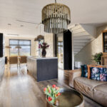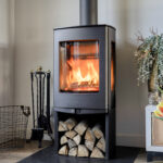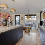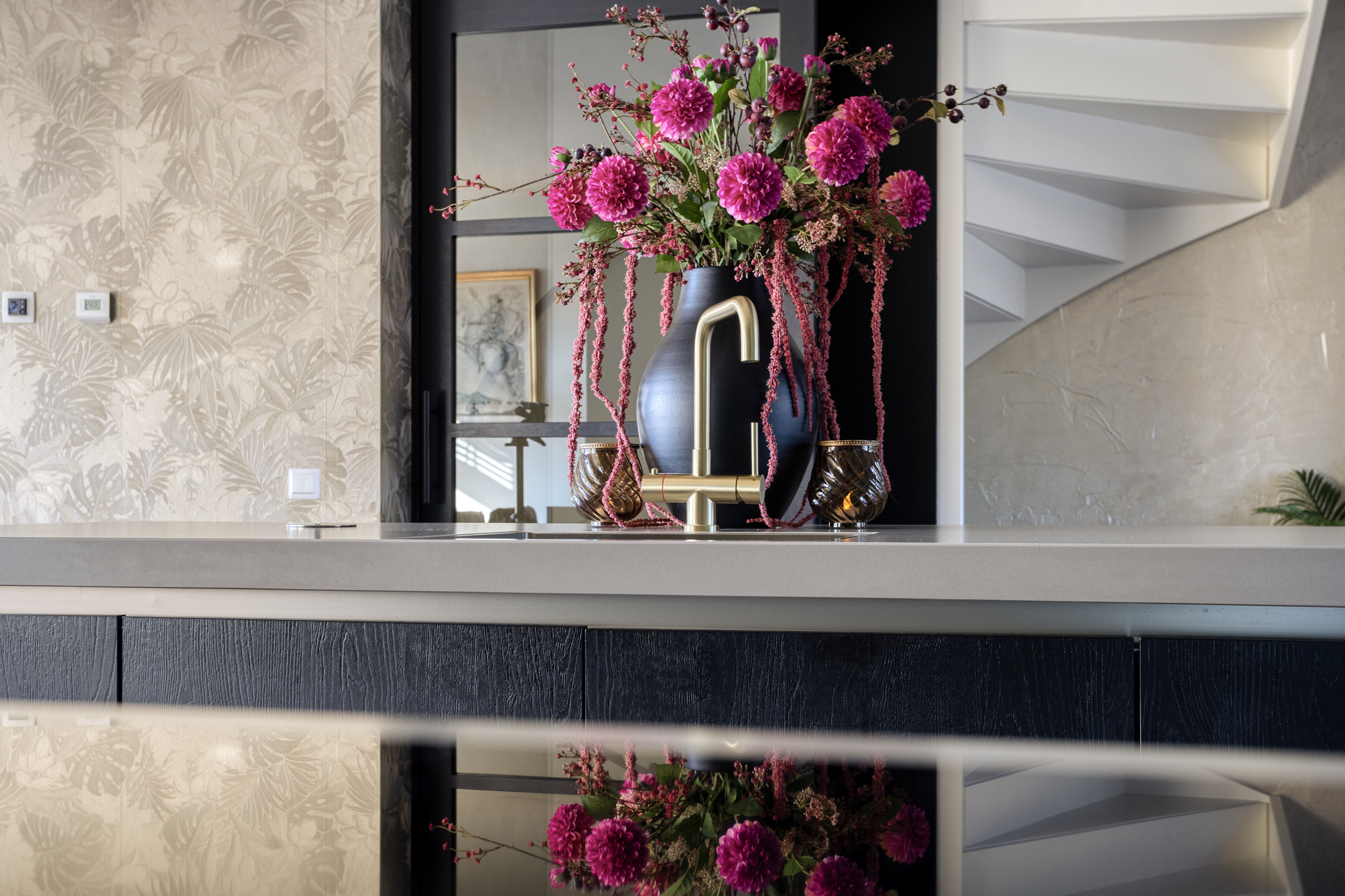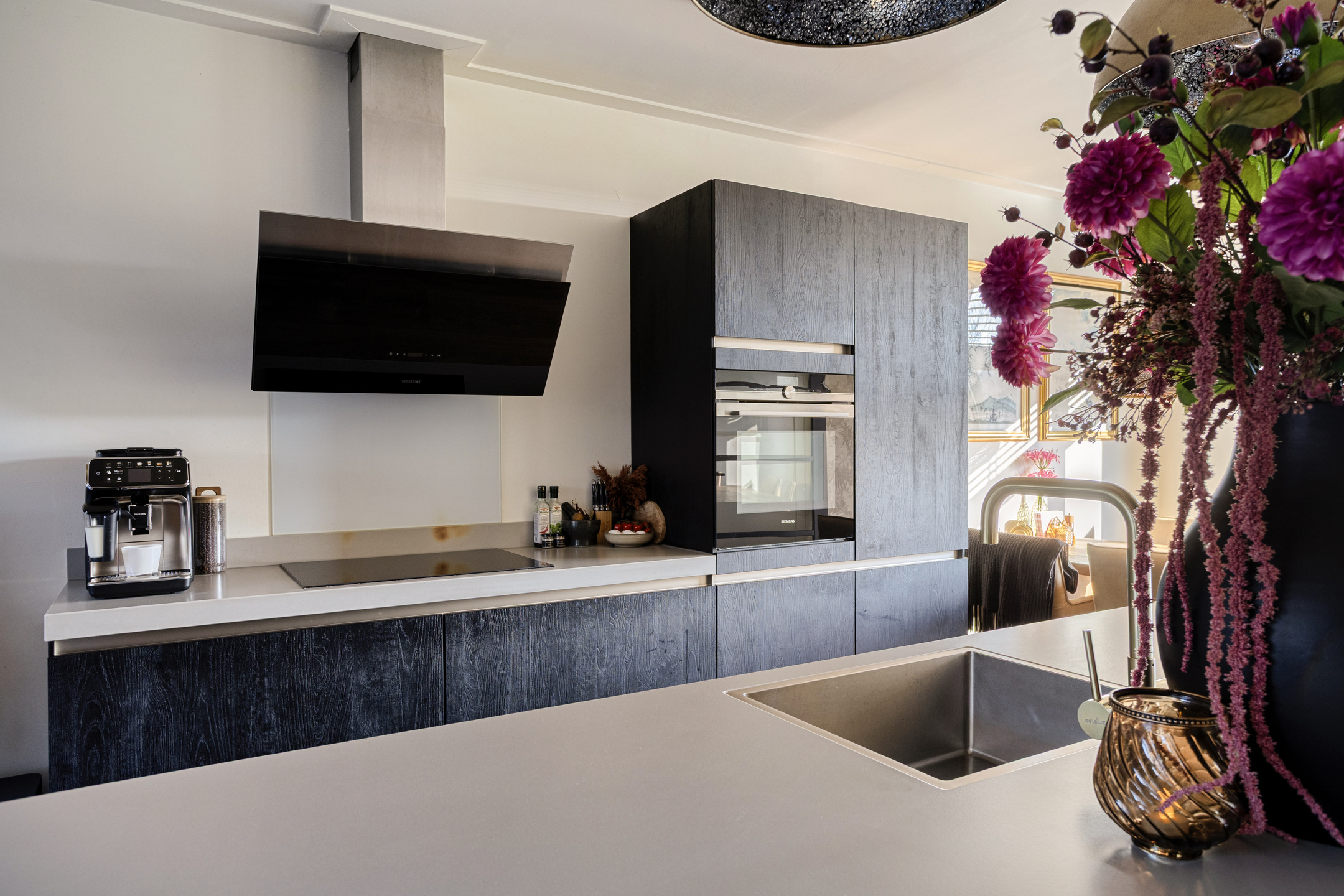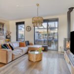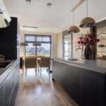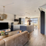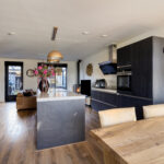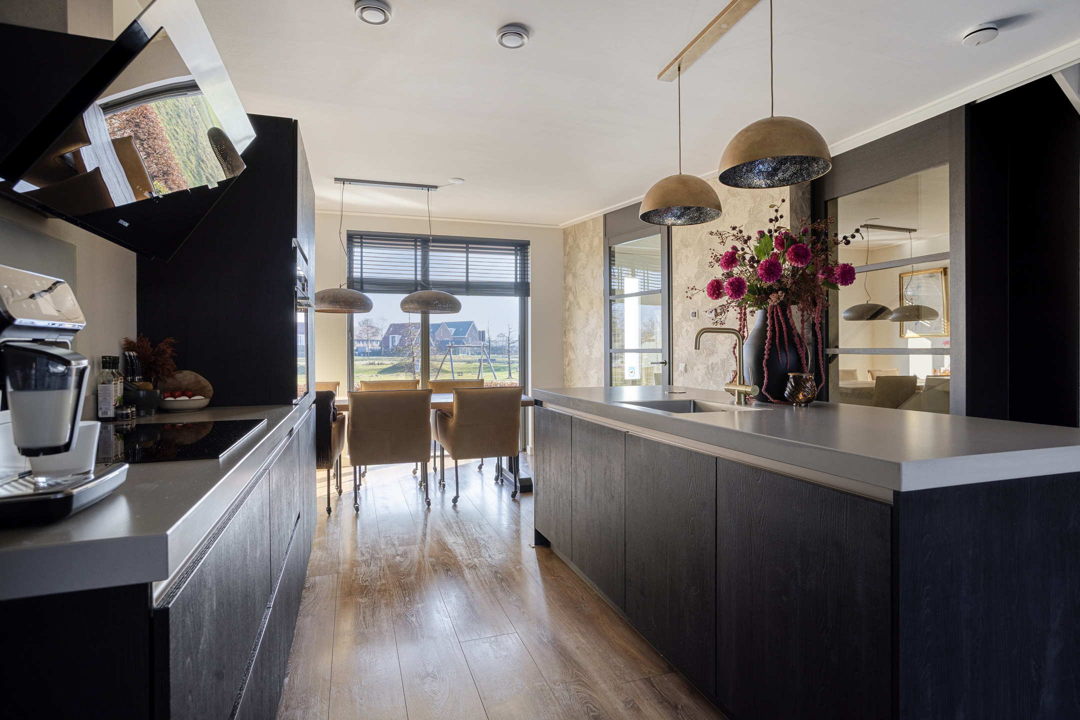 Entree met hal, praktische opbergkast, modern toilet en meterkast. De lichte woonkamer met open keuken vormt het hart van de woning. Dankzij de centrale keukenopstelling blijft u altijd verbonden met uw gezin of gasten. De sfeervolle houtkachel zorgt voor warmte en een gezellige ambiance. Een moderne schuifdeur bij de trap zorgt ervoor dat de warmte in de woonkamer blijft.