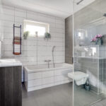 Via de overloop bereikt u drie ruime slaapkamers (ca. 14 m², 11 m² en 9 m²). De moderne badkamer is ruim opgezet en voorzien van ligbad, aparte inloopdouche, tweede toilet en wastafelmeubel.