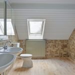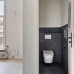 o Badkamer: Aangrenzende badkamer met toilet, dubbele wastafel en douche.