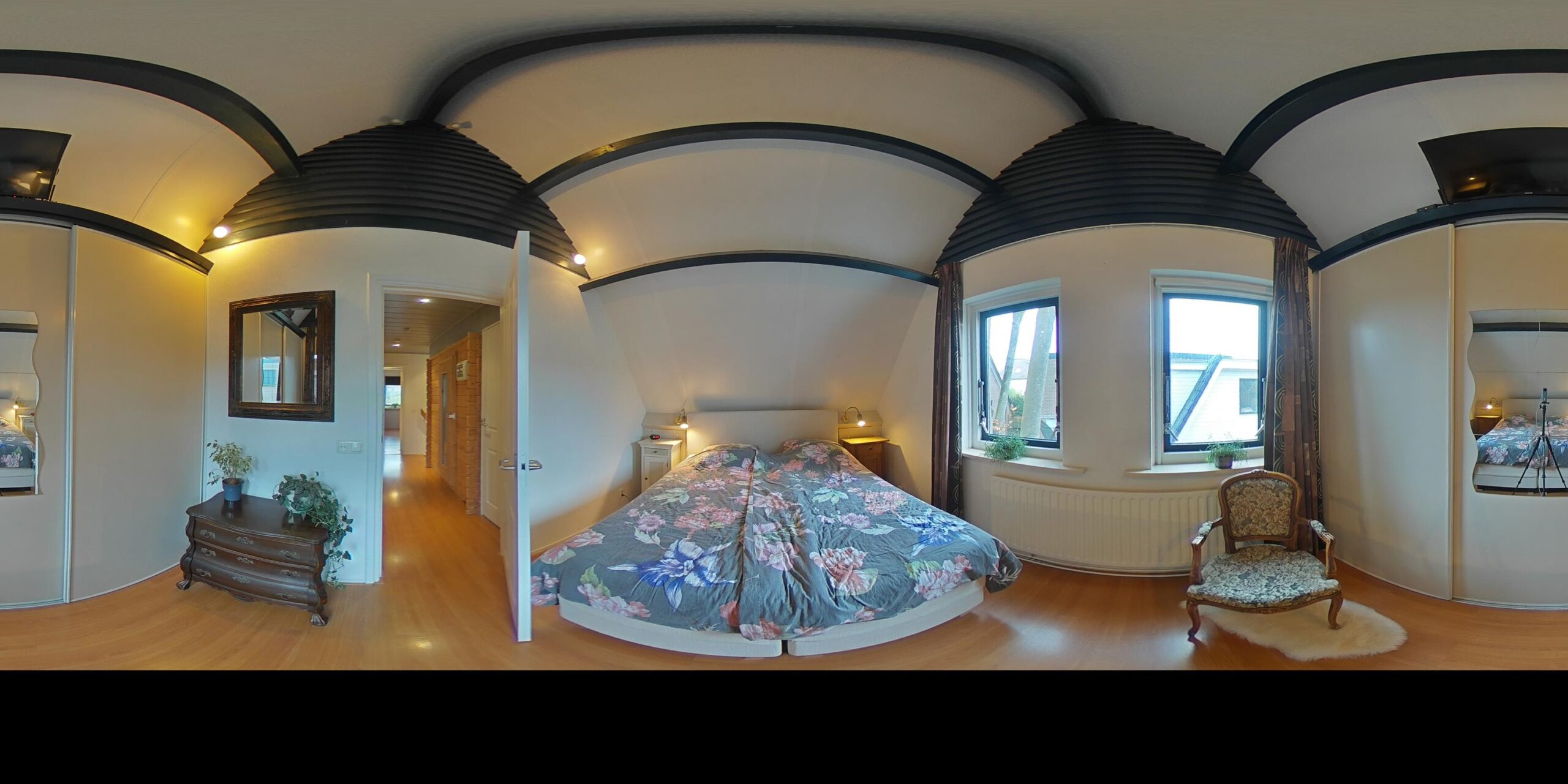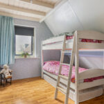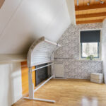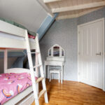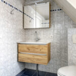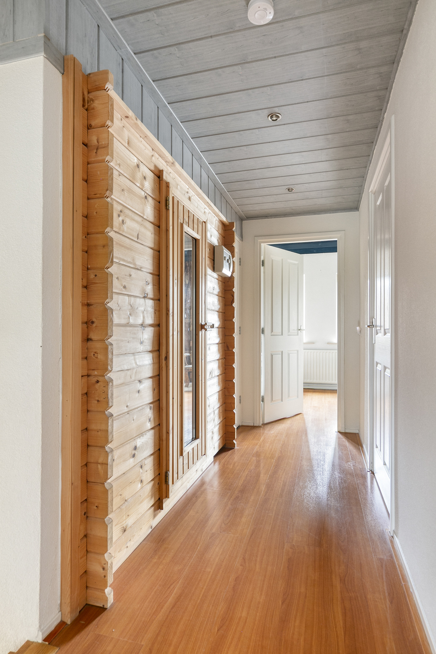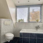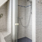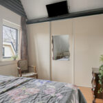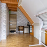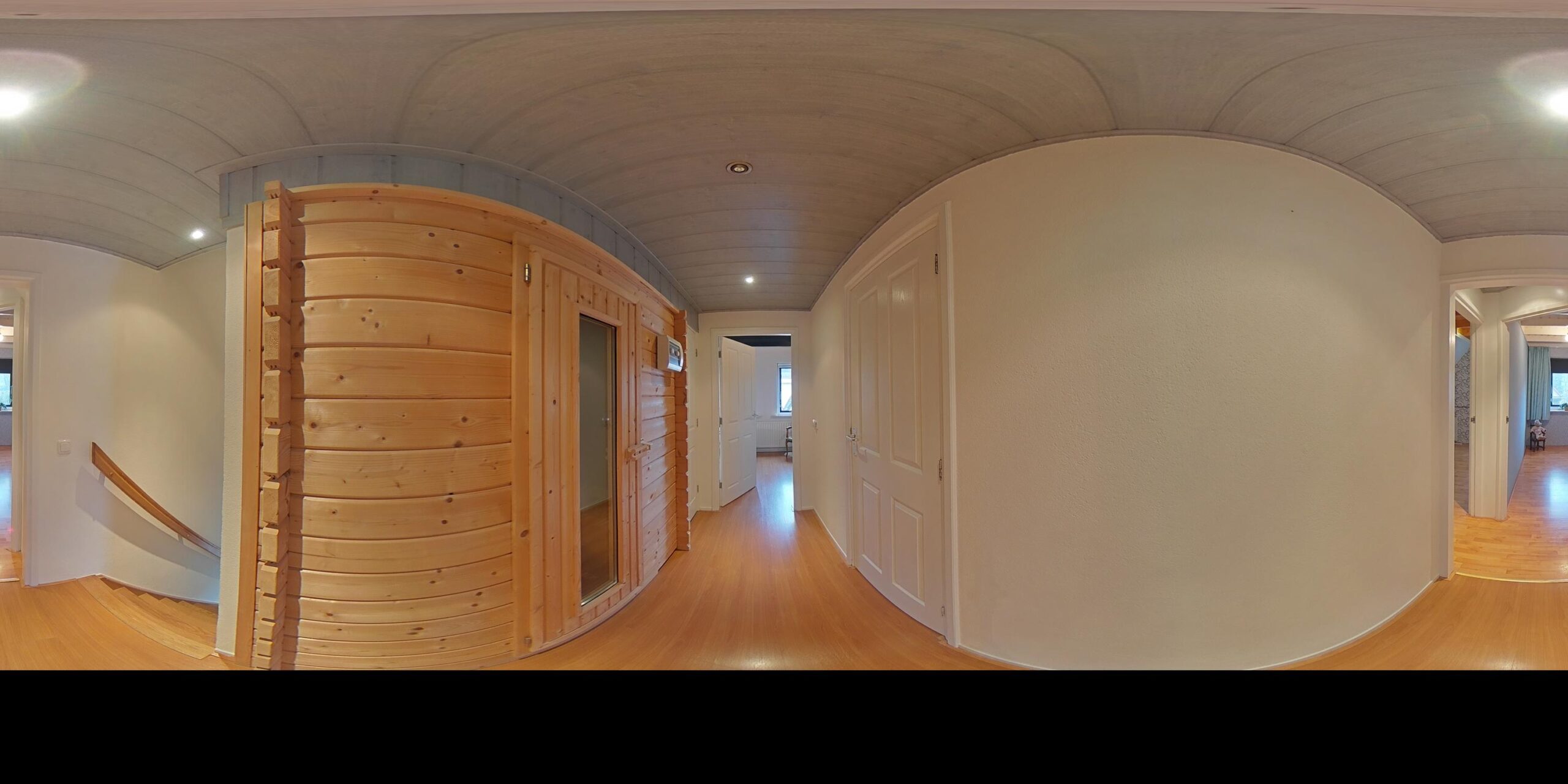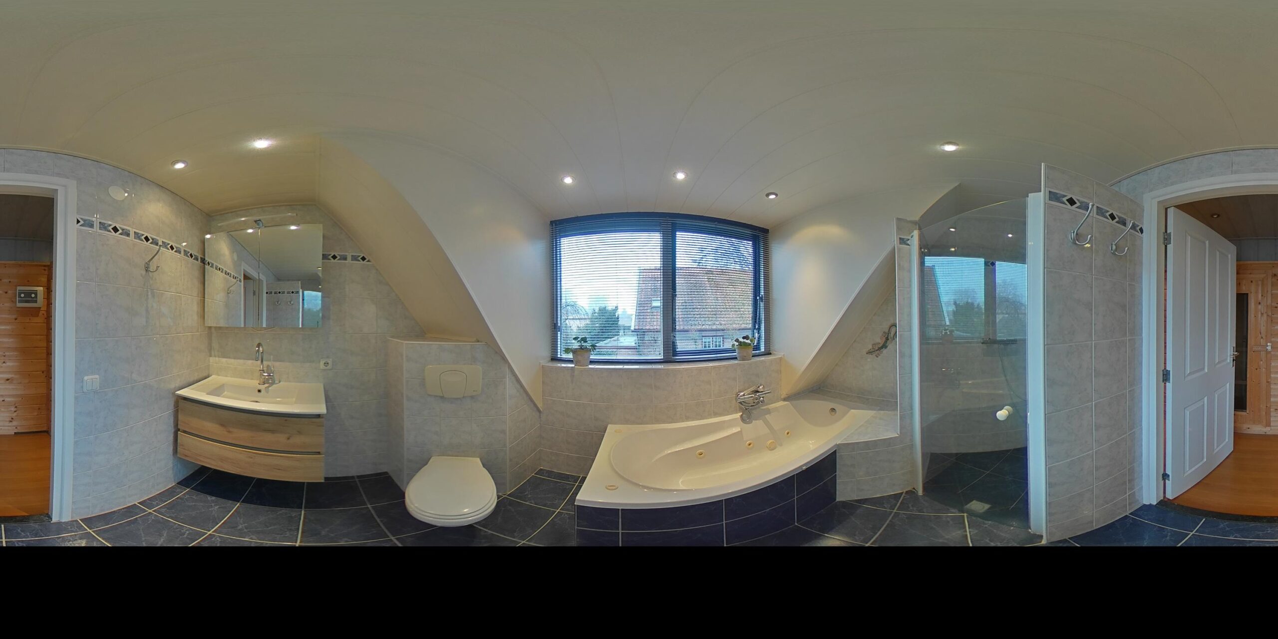 Overloop – tweede badkamer met inloopdouche, wastafelmeubel, toilet en ligbad met whirlpool – sauna – drie ruime slaapkamers (ca. 5.10 x 2.33 m, 2.40 x 4.28 m en 4.56 x 2.92 m). De ouderslaapkamer beschikt over een vaste kast. Ook deze badkamer is voorzien van vloerverwarming.