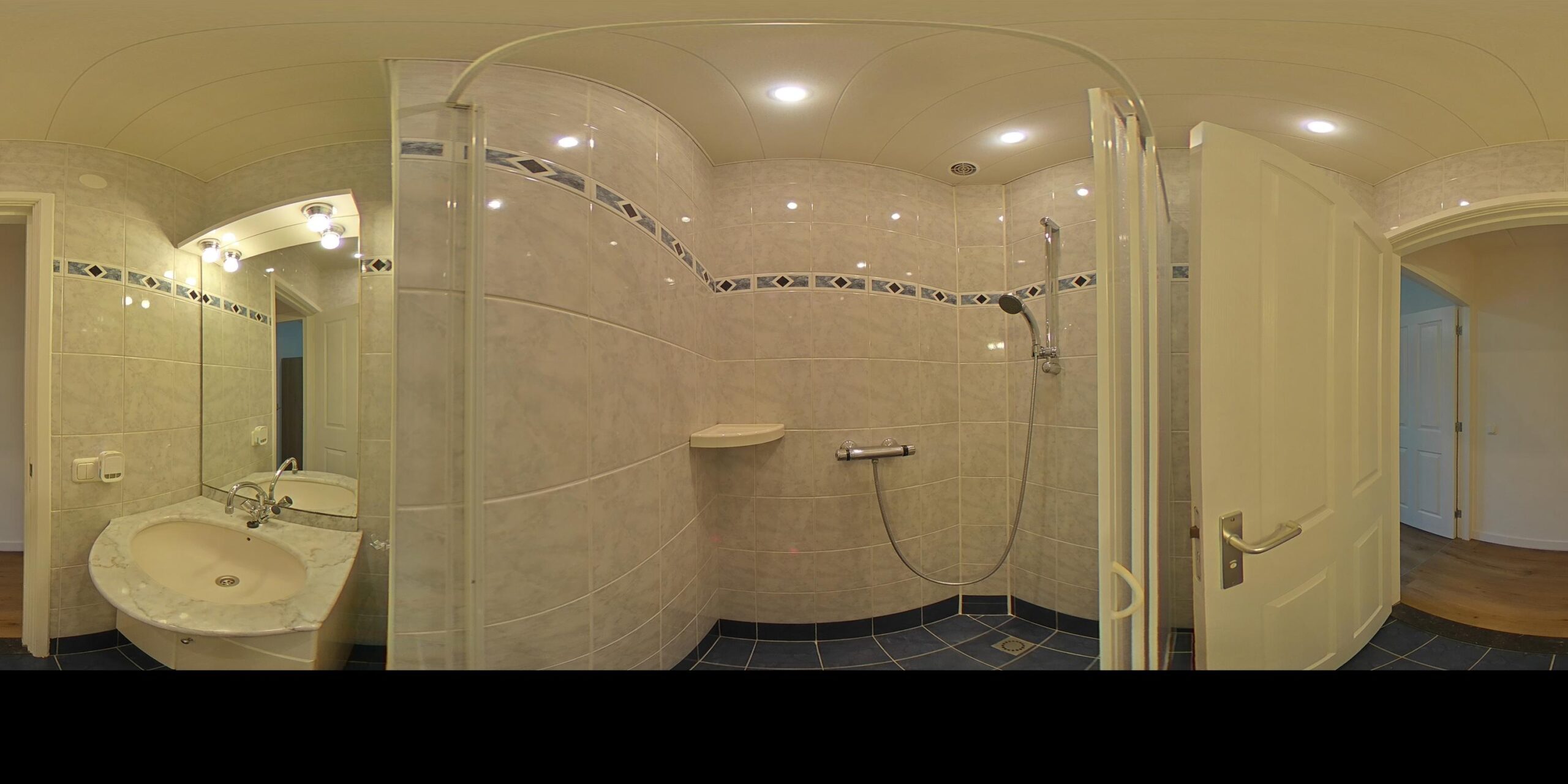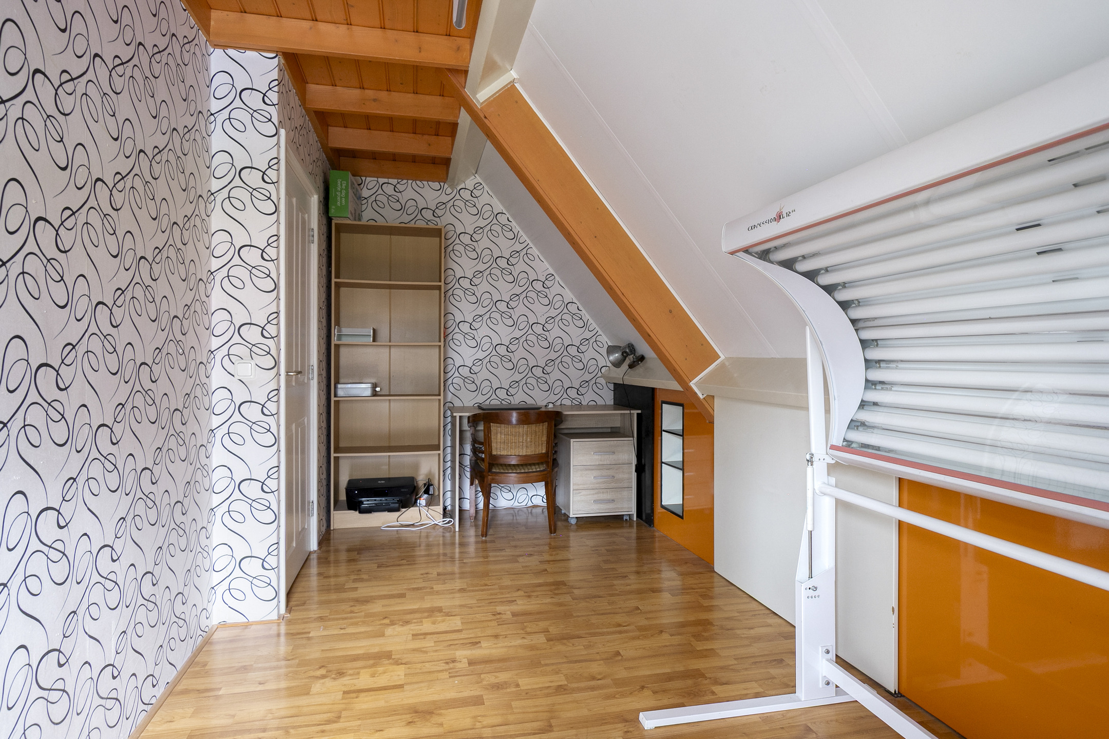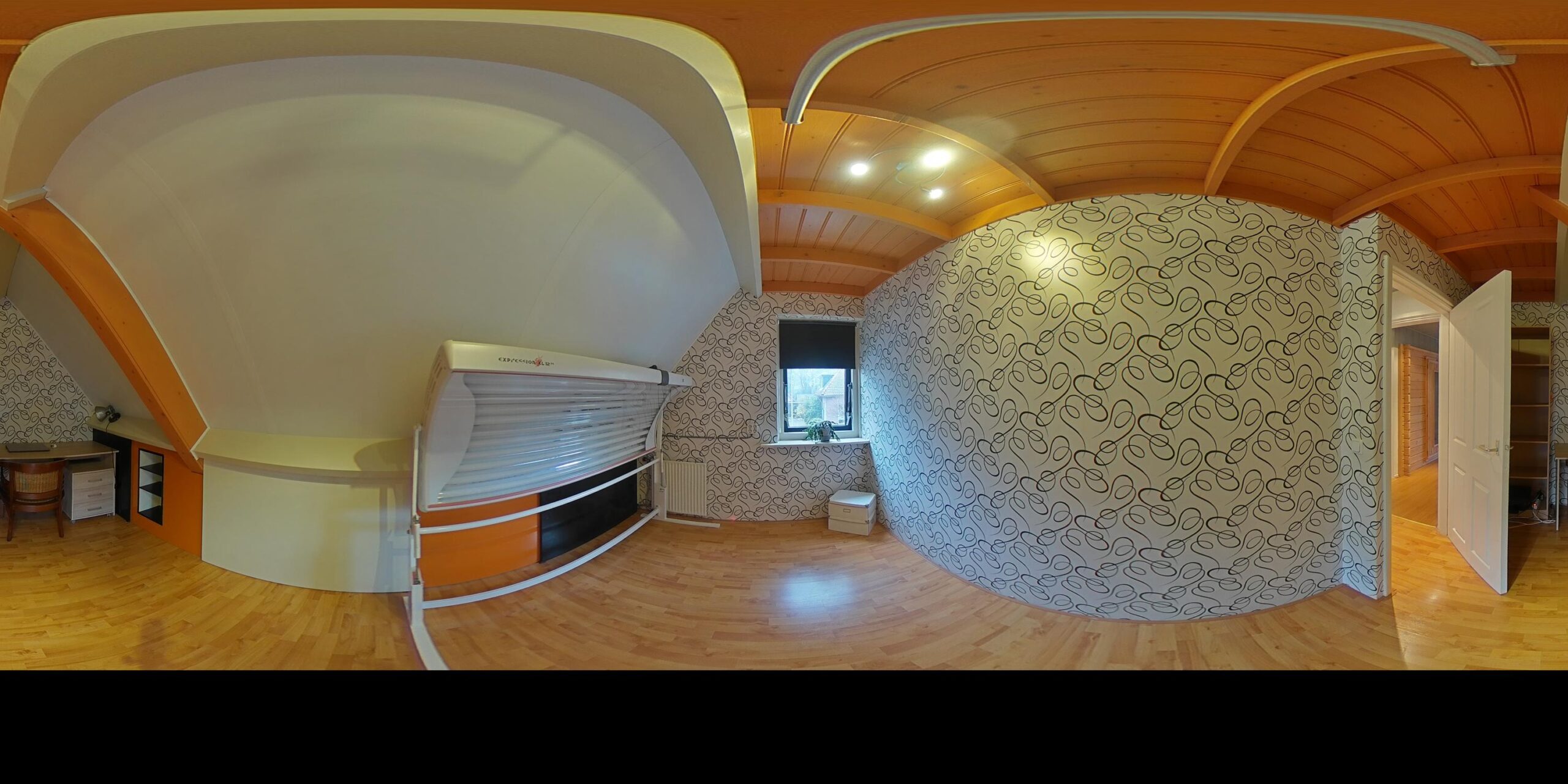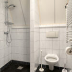 Overloop – tweede badkamer met inloopdouche, wastafelmeubel, toilet en ligbad met whirlpool – sauna – drie ruime slaapkamers (ca. 5.10 x 2.33 m, 2.40 x 4.28 m en 4.56 x 2.92 m). De ouderslaapkamer beschikt over een vaste kast. Ook deze badkamer is voorzien van vloerverwarming.